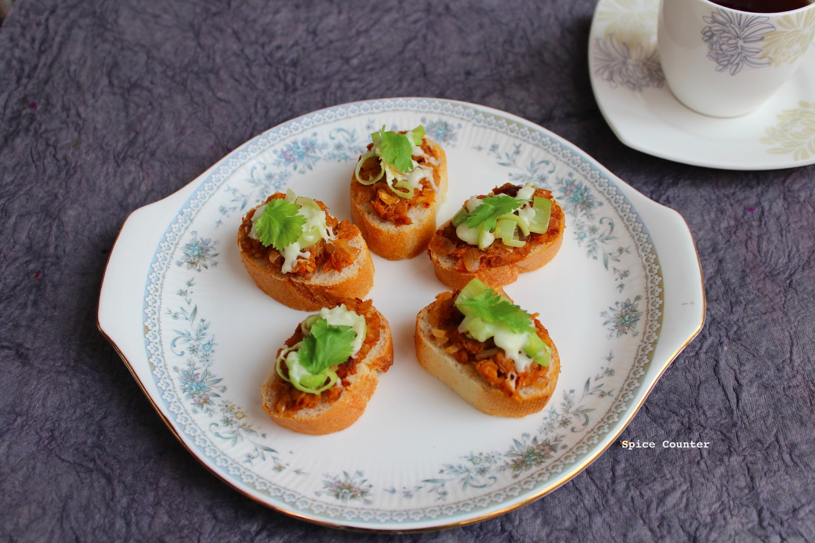 - Preheat oven to 350 F /180 C. Arrange the crostinis on a tray and bake for 2-3 minutes till the cheese has melted. Serve hot!!